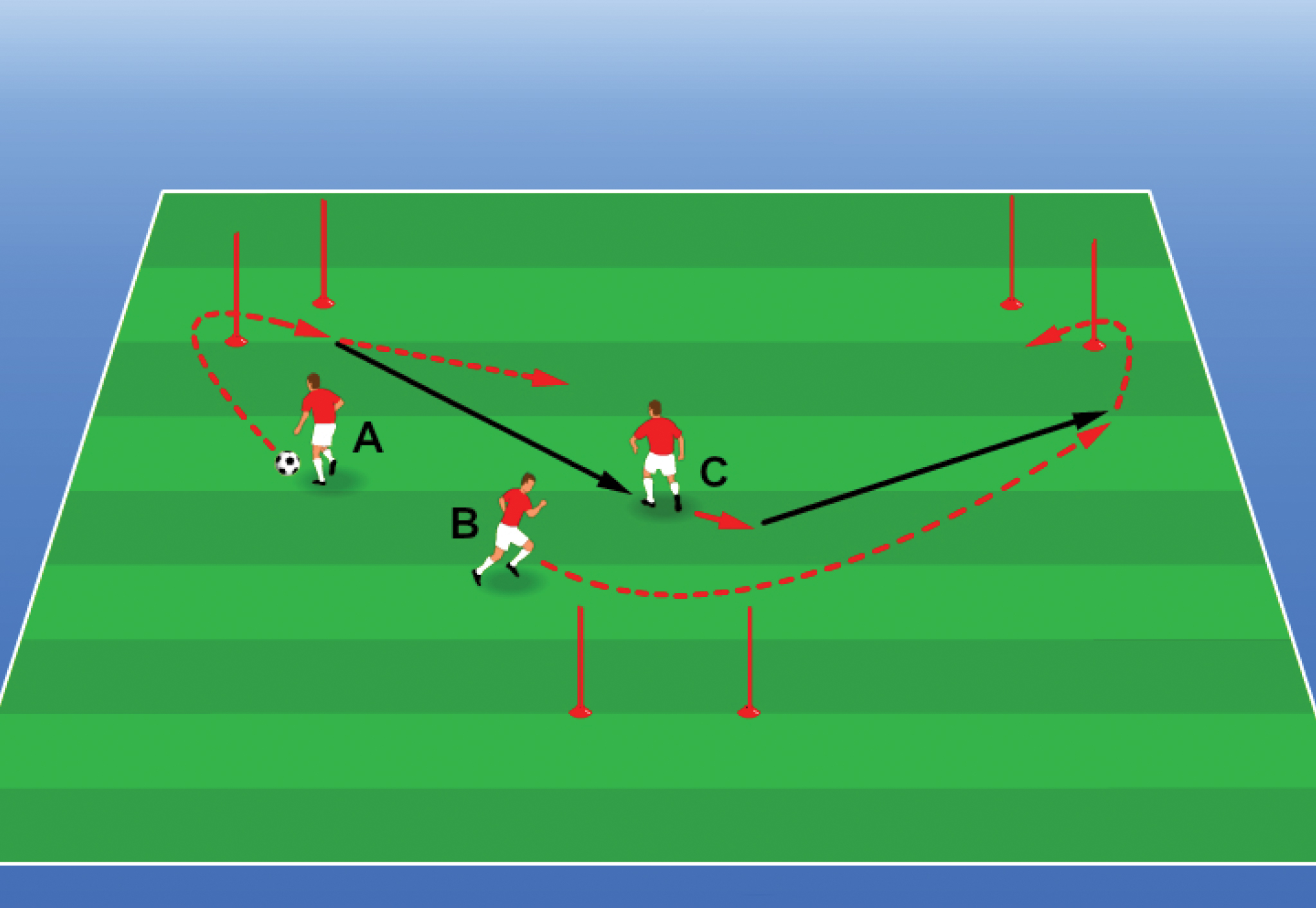 Procedure: Player A dribbles through the gate, and then looks up to play the ball to Player C (or Player B). Player C opens up and then combines with Player B on the overlapping run. Play continues in this pattern with players dribbling through the gates, looking to combine with one of the other two players. After five minutes, the direction of play changes to counter-clockwise.